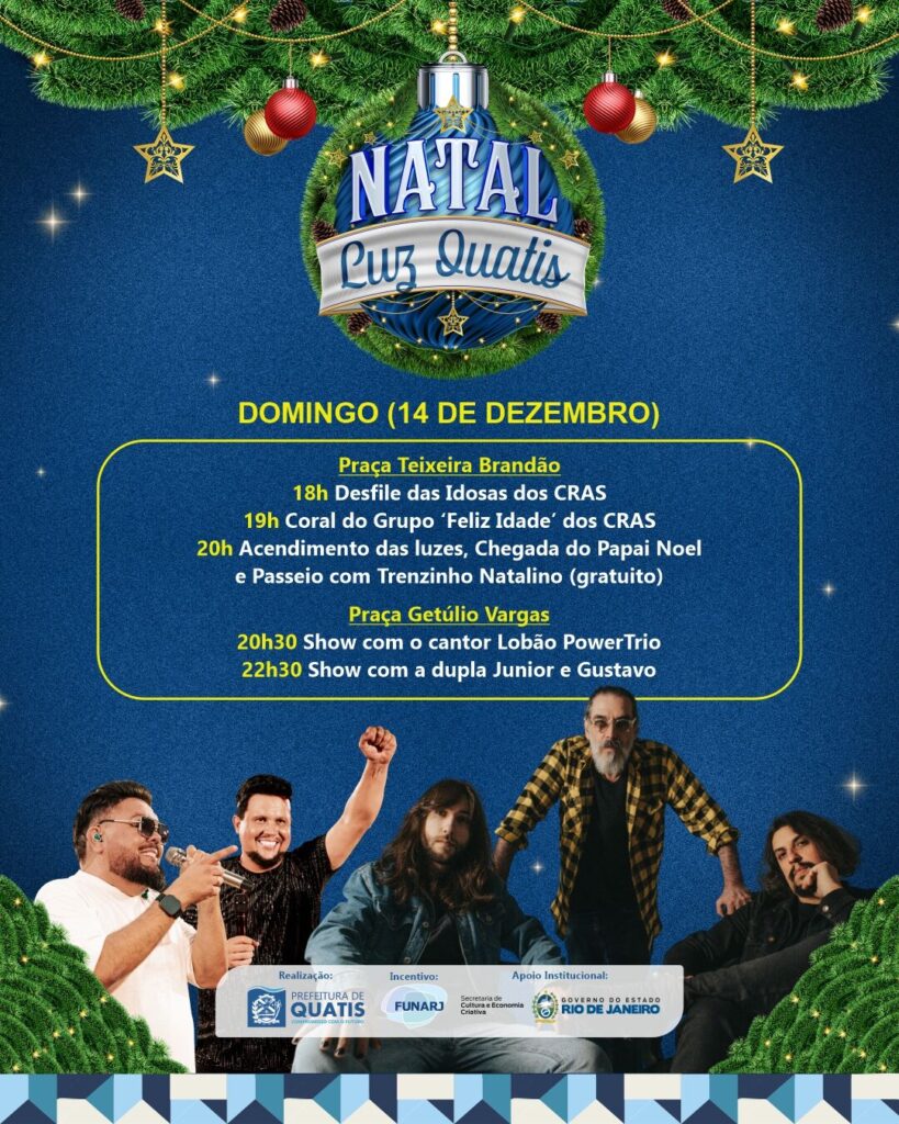 Às 18h, haverá o desfile das idosas do Centro de Referência de Assistência Social (CRAS) de Quatis. Em seguida, às 19h, o grupo ‘Feliz Idade’, também dos CRAS, se apresenta com o coral das idosas. Mais tarde, às 20h, acontece o acendimento oficial das luzes com a chegada do Papai Noel e a presença de autoridades. As atividades acontecem na Praça Dr. Teixeira Brandão. Já as atrações musicais acontecem na Praça Getúlio Vargas, que receberá dois grandes shows: às 20h30, Lobão Power Trio sobe ao palco para iniciar a noite de celebrações natalinas. Logo mais, às 22h30, quem comanda o palco é a dupla Junior e Gustavo, que chega para encerrar a festa. Durante o evento, também haverá o passeio gratuito do Trenzinho Natalino, garantindo a alegria de toda a família.