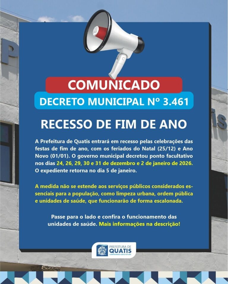 COMUNICADO: Prefeitura de Quatis decreta ponto facultativo pelas celebrações de Natal e Ano Novo; Veja os dias de recesso e saiba como funcionarão as unidades de saúde