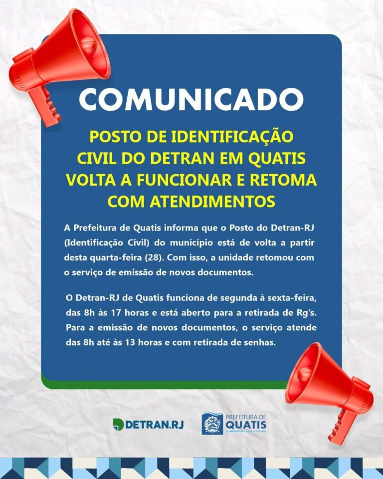 Comunicado: Posto de Identificação Civil do Detran em Quatis volta a funcionar e retoma com atendimentos