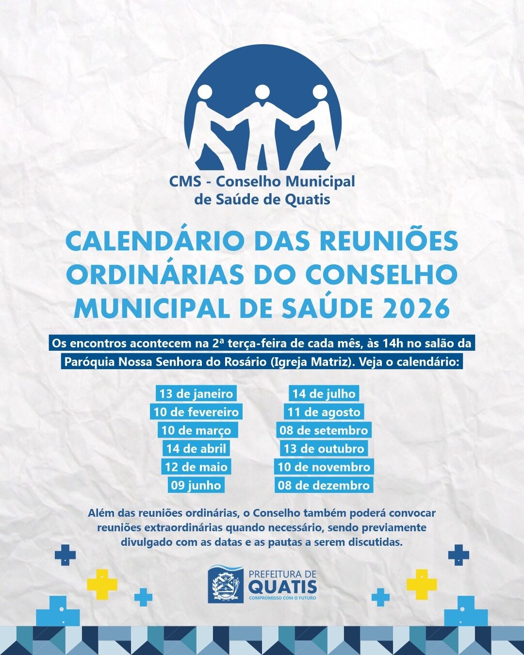 Calendário das Reuniões Ordinárias do Conselho Municipal de Saúde (CMS) de Quatis - 2026