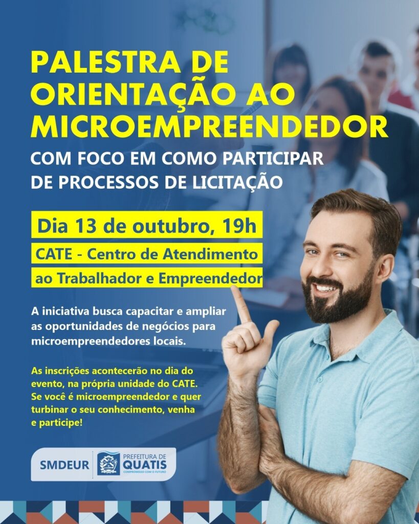 O Centro de Atendimento ao Trabalhador e Empreendedor (CATE) de Quatis vai sediar uma palestra sobre Orientação ao Microempreendedor, com foco em como participar de processos de licitação. O evento acontece na próxima segunda-feira, dia 13, às 19 horas, no CATE, que fica na Rua Nossa Senhora do Rosário, nº 185, no centro da cidade. A iniciativa busca capacitar e ampliar as oportunidades de negócios para microempreendedores locais. As inscrições acontecerão no dia da palestra, na própria unidade do CATE e são 100% gratuitas.