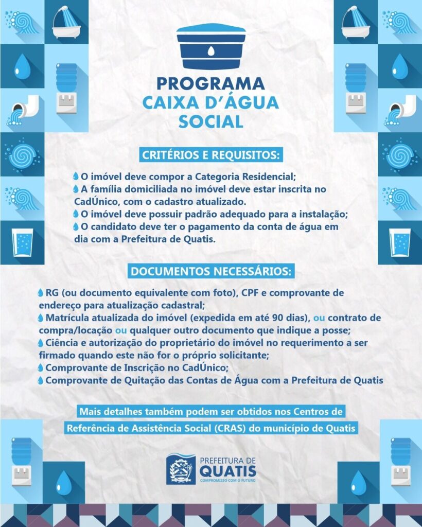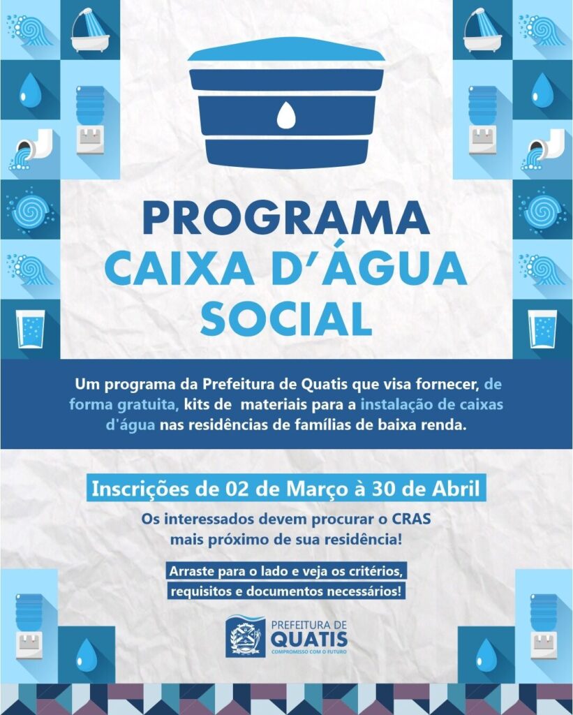 A Prefeitura de Quatis lançou o mais novo programa Caixa D’Água Social, uma iniciativa em conjunto das secretarias de Infraestrutura e de Assistência Social do município. O programa visa fornecer, de forma gratuita, kits de materiais para instalação de caixas d’água nas residências de famílias de baixa renda. Para se beneficiar com a iniciativa, proprietários de imóveis devem realizar a inscrição, que segue até 30 de abril, nos Centros de Referência de Assistência Social (CRAS) do município de Quatis. Os candidatos terão que apresentar uma série de documentos e ainda cumprir os critérios exigidos pelo programa. Veja e saiba mais:
