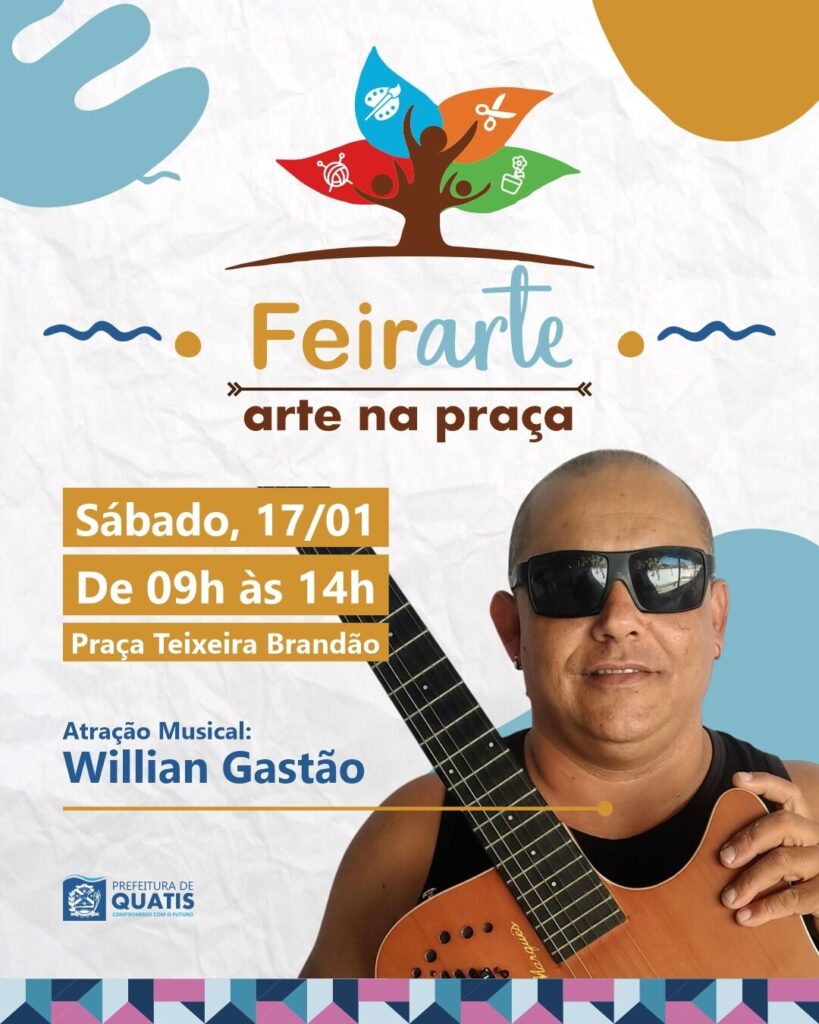 A primeira feira de artesanatos de 2026 já tem data marcada, em Quatis. O evento, promovido pela prefeitura, acontece neste sábado (17), das 9h às 14 horas, na Praça Dr. Teixeira Brandão, no centro da cidade. Em mais um ano, a FeirArte promete levar muito lazer e diversão, com entrada gratuita e aberta ao público. Nesta primeira edição de 2026, a atração musical fica por conta do cantor Willian Gastão. No local, barracas típicas de feirantes também estarão em funcionamento ao longo do evento.
