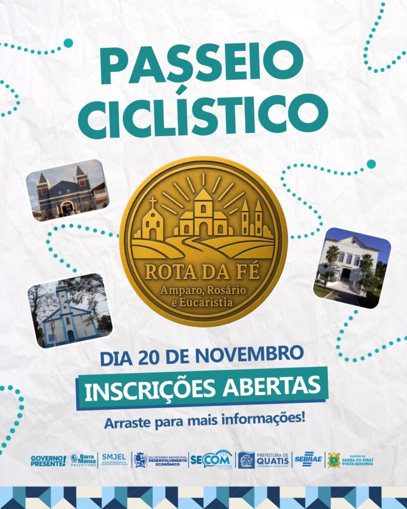 O “Rota da Fé”, projeto de turismo religioso de iniciativa entre as prefeituras de Quatis e de Barra Mansa, já tem data de lançamento. O evento de parceria entre as duas cidades está marcado para acontecer no dia 20 de novembro e será realizado por meio de um passeio ciclístico, que vai unir esporte, aventura e devoção entre fiéis. O lançamento do projeto contará com um percurso passando entre Nossa Senhora do Amparo, Quatis e Floriano. Ao todo, são 400 vagas por município e a participação é gratuita. As inscrições abrem nesta sexta-feira (7) e os interessados em participar devem se inscrever pelo link https://l1nk.dev/SAw1o