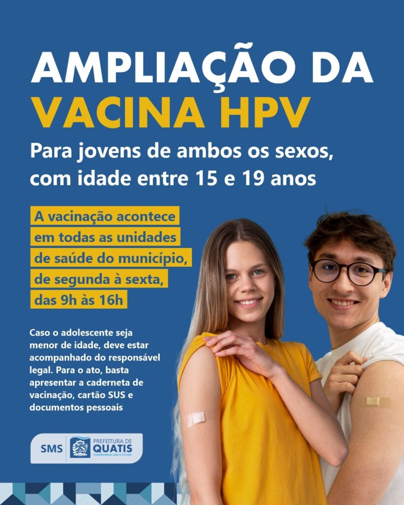 A Prefeitura de Quatis ampliou o esquema vacinal contra a HPV na cidade. Agora, meninos e meninas, com idade entre 15 e 19 anos, já podem se imunizar. A vacinação acontece em todas as unidades de saúde do município, de segunda à sexta-feira, no horário das 9h às 16 horas. Para o ato, basta apresentar a caderneta de vacinação, cartão SUS e documentos pessoais. Caso o adolescente seja menor de idade, deve estar acompanhado do responsável legal.
