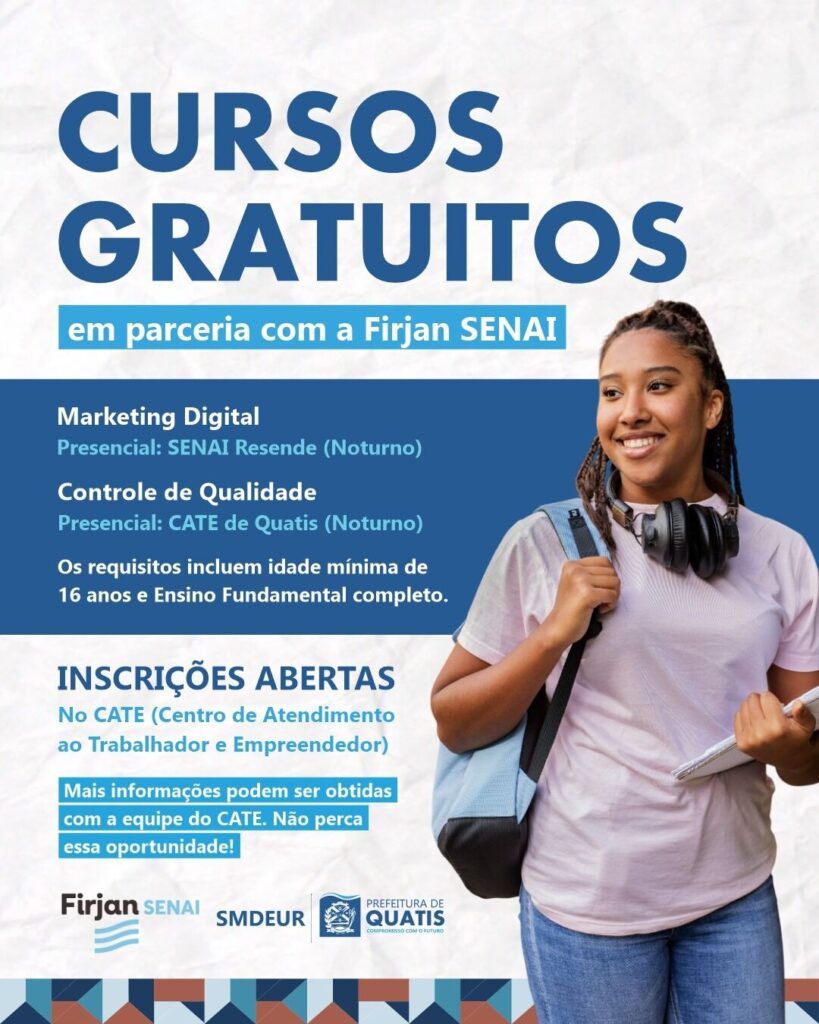 Cursos gratuitos na área – A Prefeitura de Quatis, em parceria com a Firjan SENAI, está com matrículas abertas para os cursos de Marketing Digital e Controle de Qualidade.