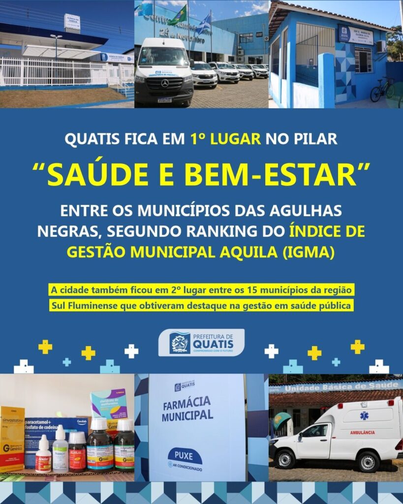 O município de Quatis se destacou no ranking do Índice de Gestão Municipal Aquila (IGMA) 2026, ferramenta que avalia o desempenho da administração pública em mais de 5.500 cidades brasileiras. Na última atualização, divulgada em fevereiro, Quatis obteve 55,73 pontos no Pilar “Saúde e Bem-Estar”, garantindo o primeiro lugar entre os municípios da Região das Agulhas Negras e a segunda posição entre os 15 municípios do Sul Fluminense, atrás apenas de Rio Claro, que somou 57,39 pontos.