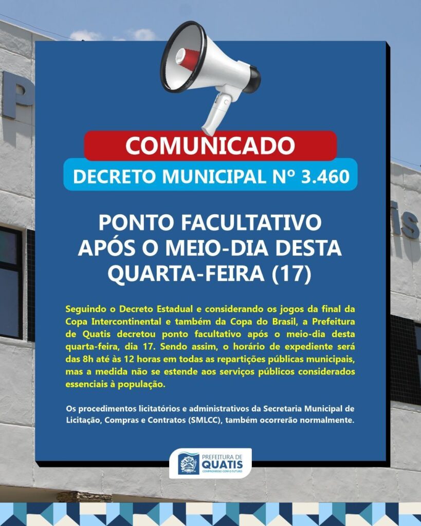 Decreto Municipal: Prefeitura terá ponto facultativo após o meio-dia desta quarta-feira (17)