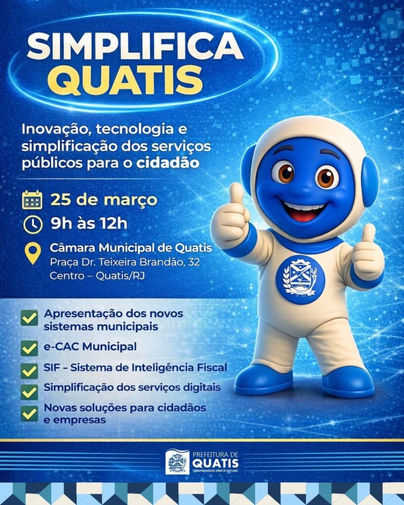 A Prefeitura de Quatis está com inscrições abertas para o Simplifica Quatis, evento voltado à modernização e à melhoria dos serviços públicos oferecidos no município. A iniciativa tem como objetivo apresentar novos sistemas municipais, entre eles o e-CAC Municipal e o Sistema de Inteligência Fiscal (SIF), além de outras ações que visam tornar os serviços digitais mais simples e acessíveis tanto para a população quanto para as empresas.