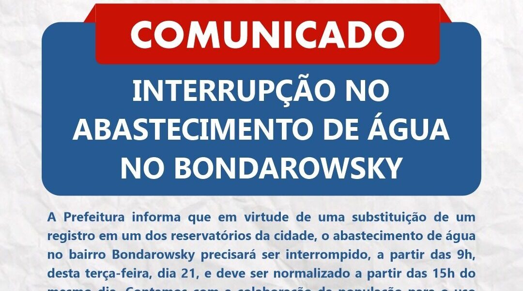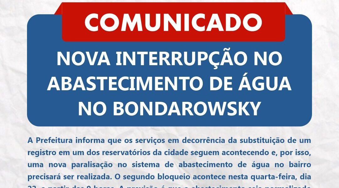 Em decorrência da substituição de um registro em um dos reservatórios da cidade, que interrompeu o abastecimento de água no bairro Bondarowsky, nesta terça-feira (21), como já havia sido comunicado pelo governo municipal, a Prefeitura de Quatis informa que os serviços seguem acontecendo e, por isso, uma nova paralisação no sistema de abastecimento de água no bairro precisará ser realizada.