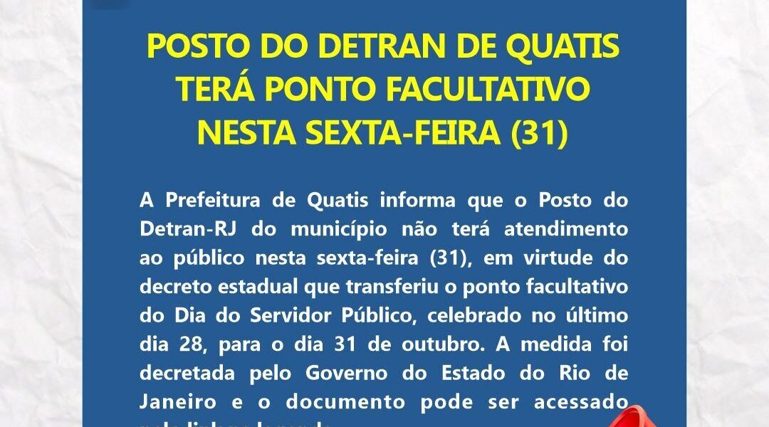 A Prefeitura de Quatis informa que o Posto do Detran-RJ do município não terá atendimento ao público nesta sexta-feira (31), em virtude do decreto estadual que transferiu o ponto facultativo do Dia do Servidor Público, celebrado no último dia 28, para o dia 31 de outubro. A medida foi decretada pelo Governo do Estado do Rio de Janeiro (Gov-RJ) e