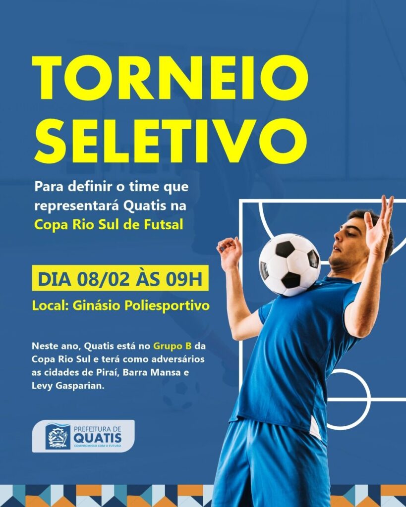E neste domingo, dia 08/02, acontece o torneio seletivo que vai definir o time que representará o município de Quatis na competição.