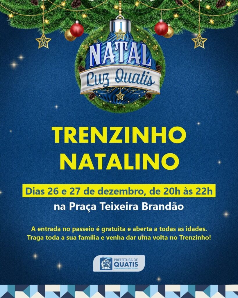 É diversão garantida para toda a família neste fim de ano! Na sexta, 26/12, e no sábado, 27/12, o Trenzinho de Natal estará novamente em Quatis na Praça Teixeira Brandão, das 20h às 22 horas.